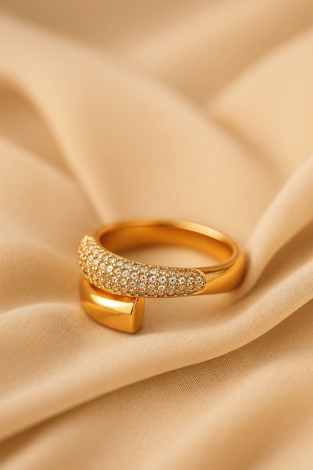 A timeless round golden ring crafted in China gold, beautifully detailed with shimmering white crystals for a refined look.