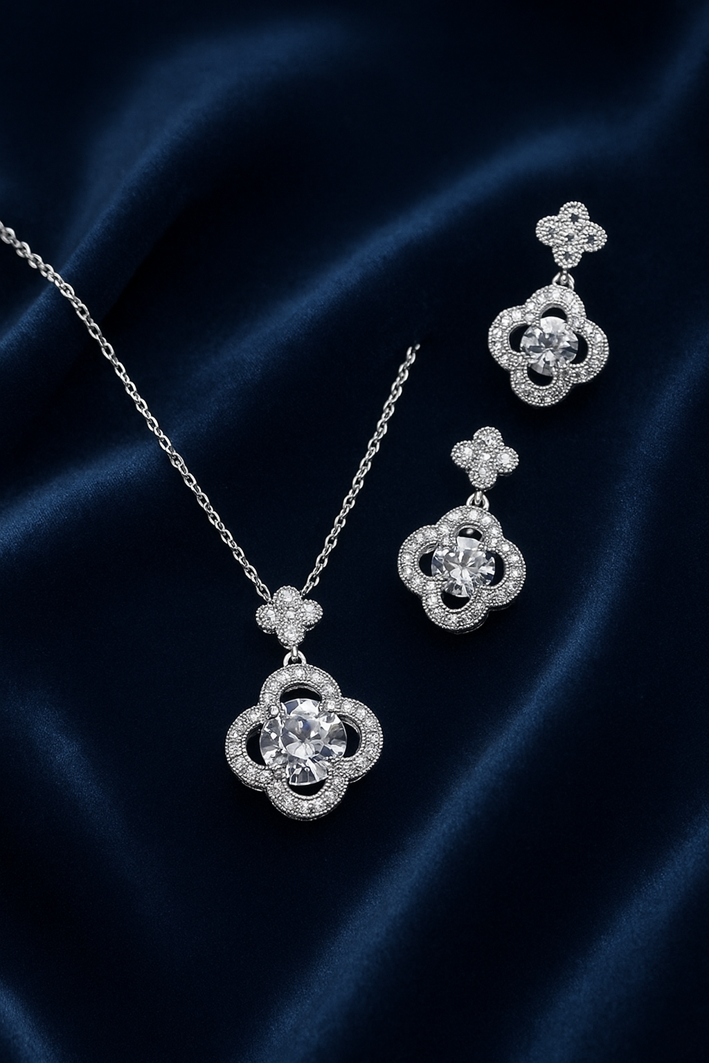 Elevate your style with the Crystal Bloom Jewelry Set, a graceful blend of silver tones and white accents designed to add pure elegance to any look. This set includes a delicate necklace and matching earrings, featuring a timeless floral-inspired design that sparkles with sophistication.