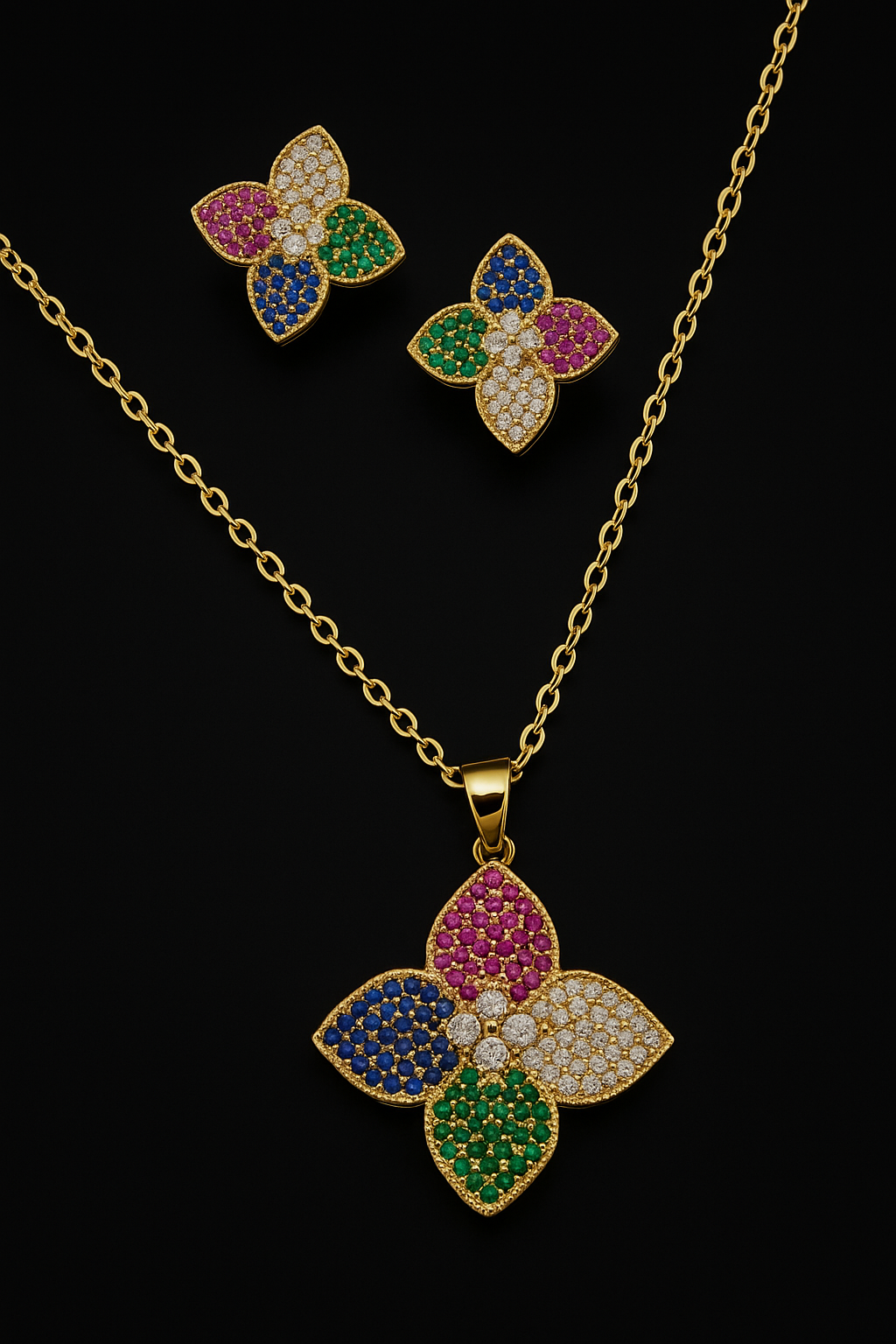 Add timeless sparkle to your look with the Glitter Blossom Jewelry Set, beautifully designed to make every moment shine. This elegant set includes a dazzling necklace and matching earrings, crafted with a delicate flower-inspired design and finished with shimmering stones that catch the light from every angle.